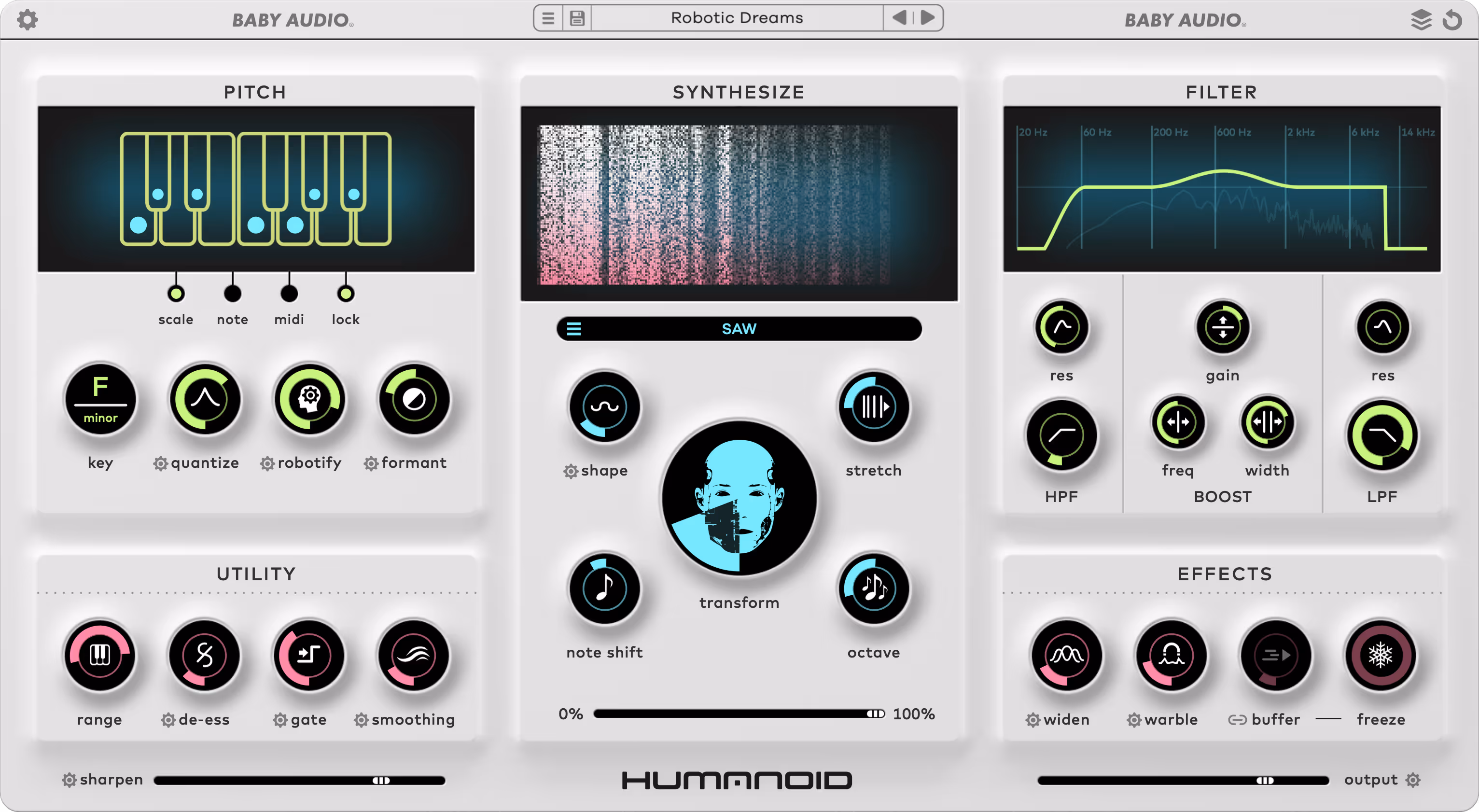At its most extreme, Humanoid will turn a voice fully into a synthesizer, while moderate settings will add a subtle electronic shine to the vocal mix.